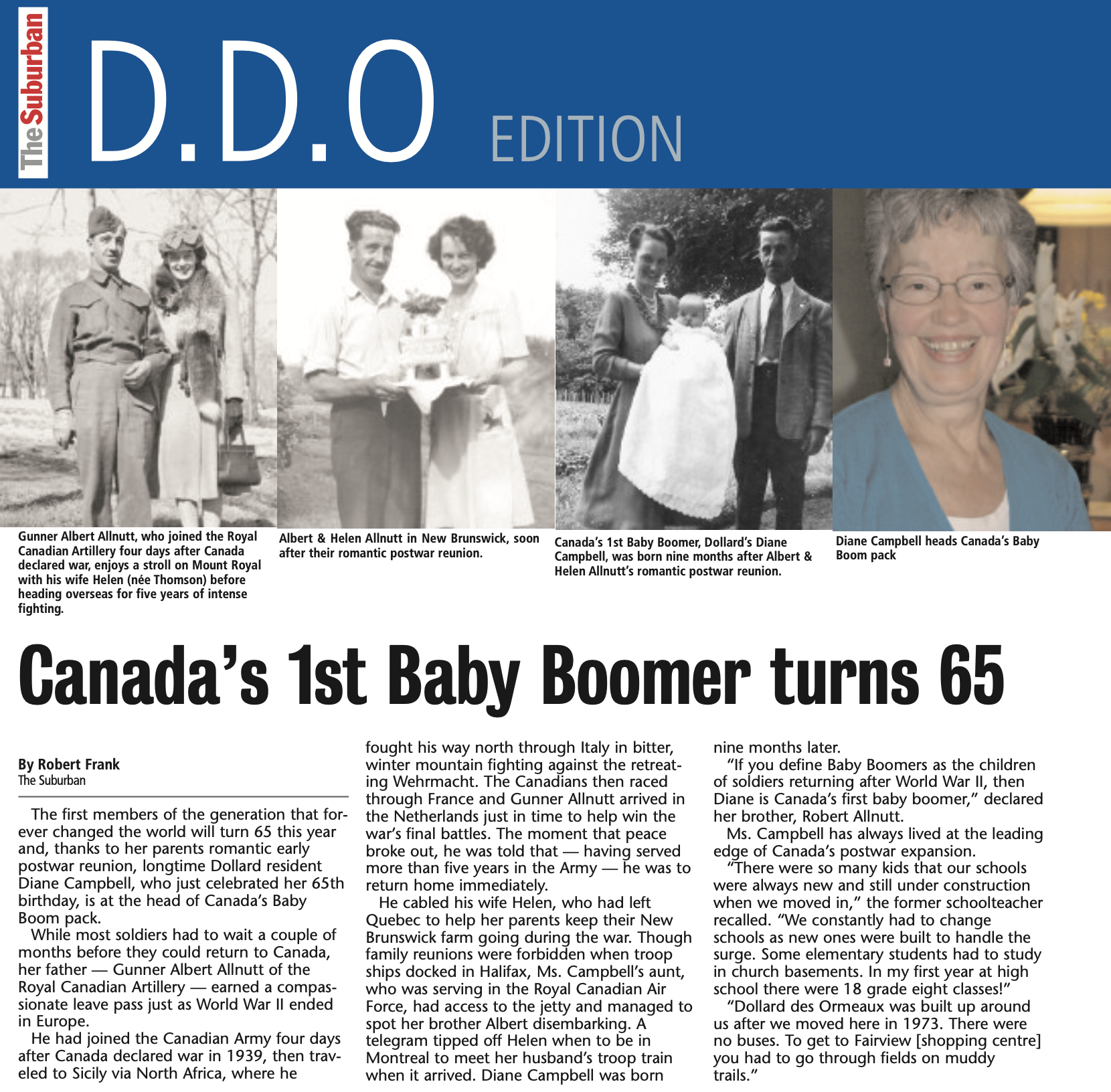 The first members of the generation that forever changed the world will turn 80 this year and, thanks to her parents’ romantic early postwar reunion, longtime Dollard des Ormeaux, Quebec, resident Diane Campbell, who just celebrated her 80th birthday, is at the head of Canada’s Baby Boom pack.